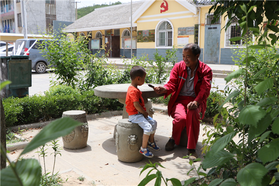 新寨河村村民馬生軍(右)帶著孫子在廣場上玩耍(供圖 子長縣委宣傳部)