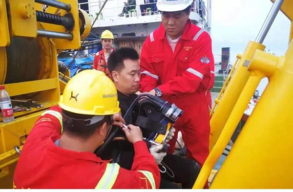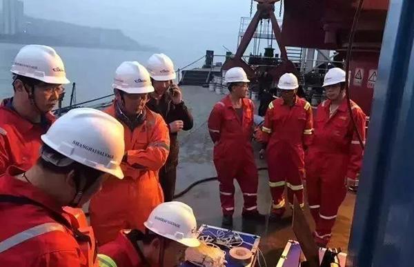 6時50分,設備調試完成后,交通運輸部上海打撈局兩名專業潛水員第一次下水摸探。