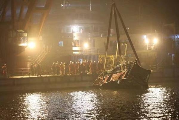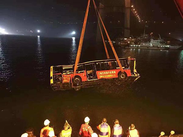 21時31分,開始對重慶萬州墜江公交車進行起吊工作。23時45分,成功將墜江公交車整體打撈出水。