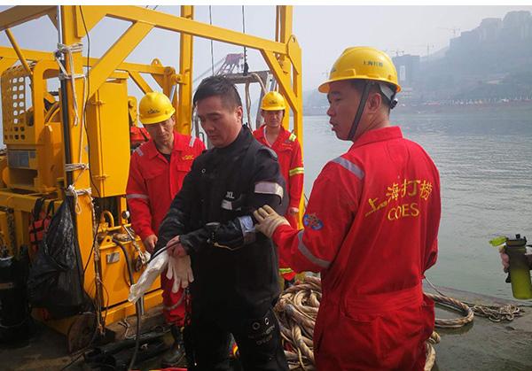 14時46分,第八批潛水員下水,完成墜江公交車車頭吊帶的安裝。