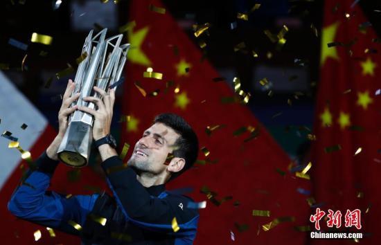 資料圖,小德第四次奪得上海網(wǎng)球大師賽的冠軍。圖為德約科維奇高舉獎杯。湯彥俊 攝