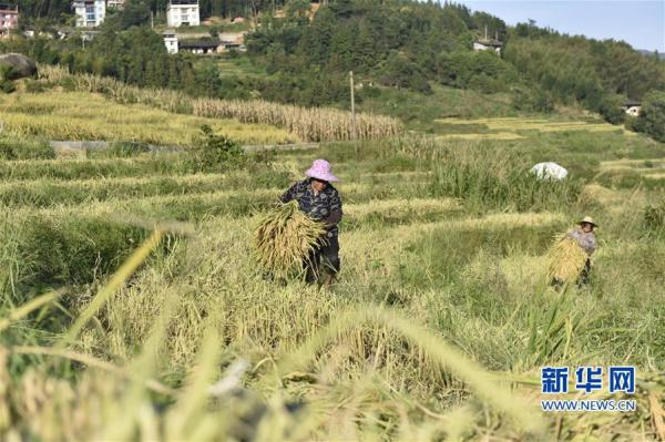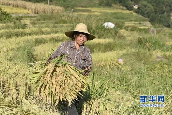 10月2日,福建省三明市尤溪縣聯(lián)合鎮(zhèn)東邊村村民在聯(lián)合梯田上收割稻谷。新華社記者 林超 攝