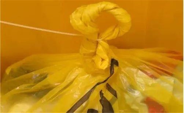 當(dāng)盛裝的醫(yī)療廢物達(dá)到包裝物或者容器的3/4時(shí),可以采用這種有效的封口方式,家里的普通垃圾袋也適用哦。