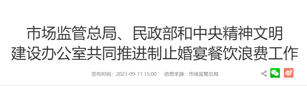 《通知》強調(diào),各級市場監(jiān)管部門、民政部門和文明辦要加強制度供給,強化對婚宴服務(wù)經(jīng)營者的日常監(jiān)管和行政指導(dǎo),做好新人結(jié)婚登記時的提示提醒,積極營造浪費可恥、節(jié)約為榮的氛圍,促進制止餐飲浪費成為全社會的行動自覺。