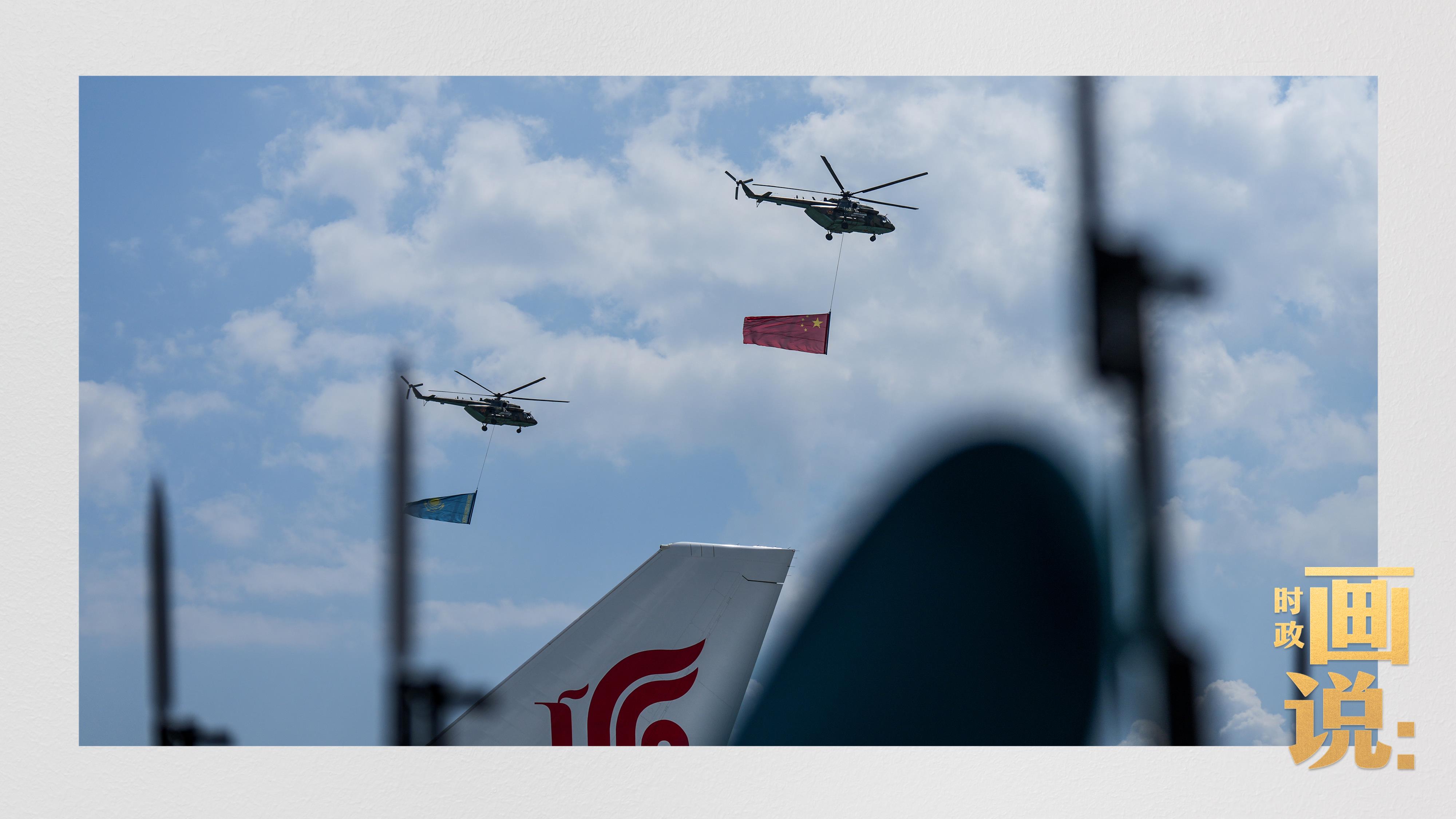 兩架米-8直升機分別懸掛中、哈國旗飛過機場上空以示歡迎。