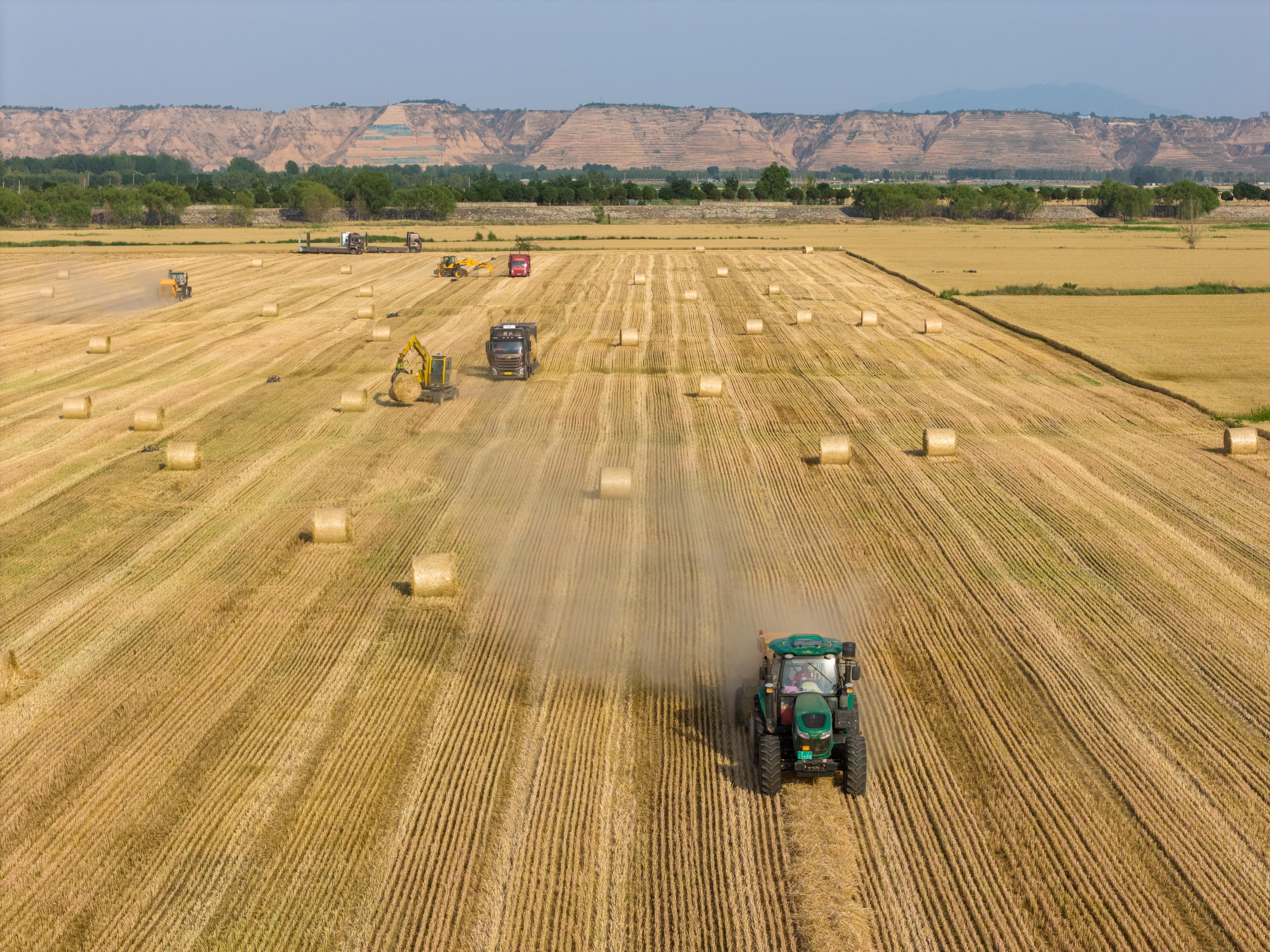 △據國家統計局發布的數據,2025年全國夏糧總產量14973.8萬噸,實現穩產豐收。圖為今年6月,山西運城裴莊鎮黃河灘涂上,農機手忙著實施小麥秸稈打捆和裝車運輸作業。