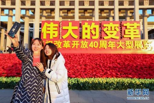 12月18日,參觀者在“偉大的變革——慶祝改革開放40周年大型展覽”外自拍留影。 截至當日,在中國國家博物館舉行的“偉大的變革——慶祝改革開放40周年大型展覽……