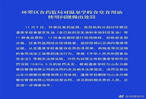 人民網濟南11月13日電(翟晨曦)13日,山東省威海市環翠區人民政府新聞辦公室官方微博@環翠發布發布微博,環翠區食藥監局對溫泉學校食堂食用油使用問題做出處罰……