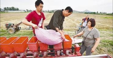 5月29日,在河南省南陽市唐河縣黑龍鎮大朱莊村,農民在給播種機添加種子。目前,唐河縣農民利用有利的天氣……