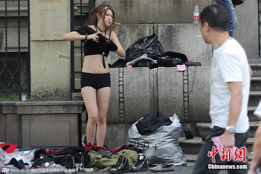 2015年9月4日,杭州中山中路一幢西式建筑外,幾名模特在街頭為網(wǎng)店拍攝秋冬服裝新品,為節(jié)省換裝時間,模特們淡定當(dāng)街脫掉衣服,只剩內(nèi)衣內(nèi)褲,迅速換上另一套服……