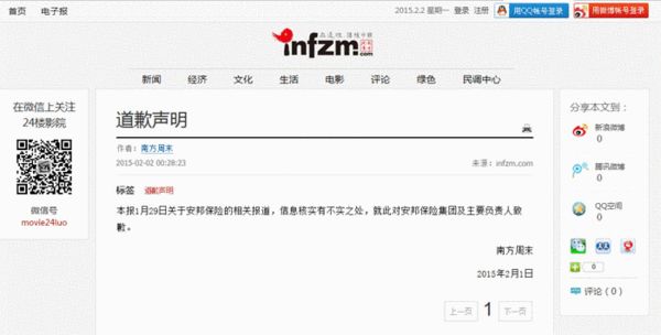 南方周末凌晨就安邦保險報道發道歉聲明