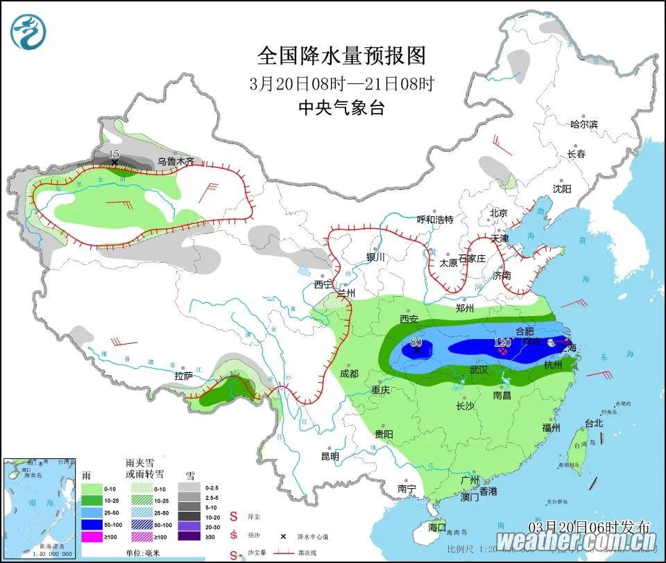 預計,3月20日08時至21日08時,四川盆地東北部、陜西東南部、湖北、河南南部、安徽中南部、江蘇南部、上海、浙江北部等地有大雨,其中,重慶北部、陜西東南部、湖北北部和東部、河南東南部、安徽中部和西南部、江蘇南部、上海、浙江北部等地部分地區有暴雨,局地有大暴雨(100~120毫米),上述部分地區伴有短時強降水(最大小時降雨量20~40毫米,局地可超過50毫米),局地有雷暴大風或冰雹等強對流天氣。