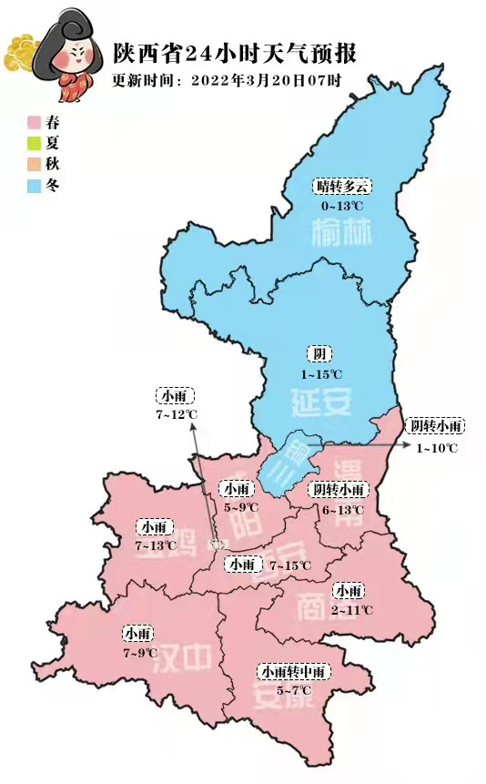 預計今天晚上:城區及北部區縣陰天有小雨,周至、鄠邑、長安、藍田陰天有小到中雨。最高氣溫:城區15℃,其他區縣13℃~15℃,最低氣溫:城區7℃,其他區縣4℃~6℃。風向:東北風,風力:2級 。