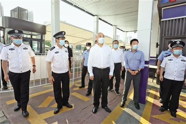 7月9日,省委書記劉國中到西安市調(diào)研檢查重點(diǎn)行業(yè)運(yùn)行保障工作并看望高溫下的一線工作人員。圖為在西安繞城高速公路曲江出口檢查站,劉國中看望執(zhí)勤民警和疫情防控工作人員。記者 張辰攝