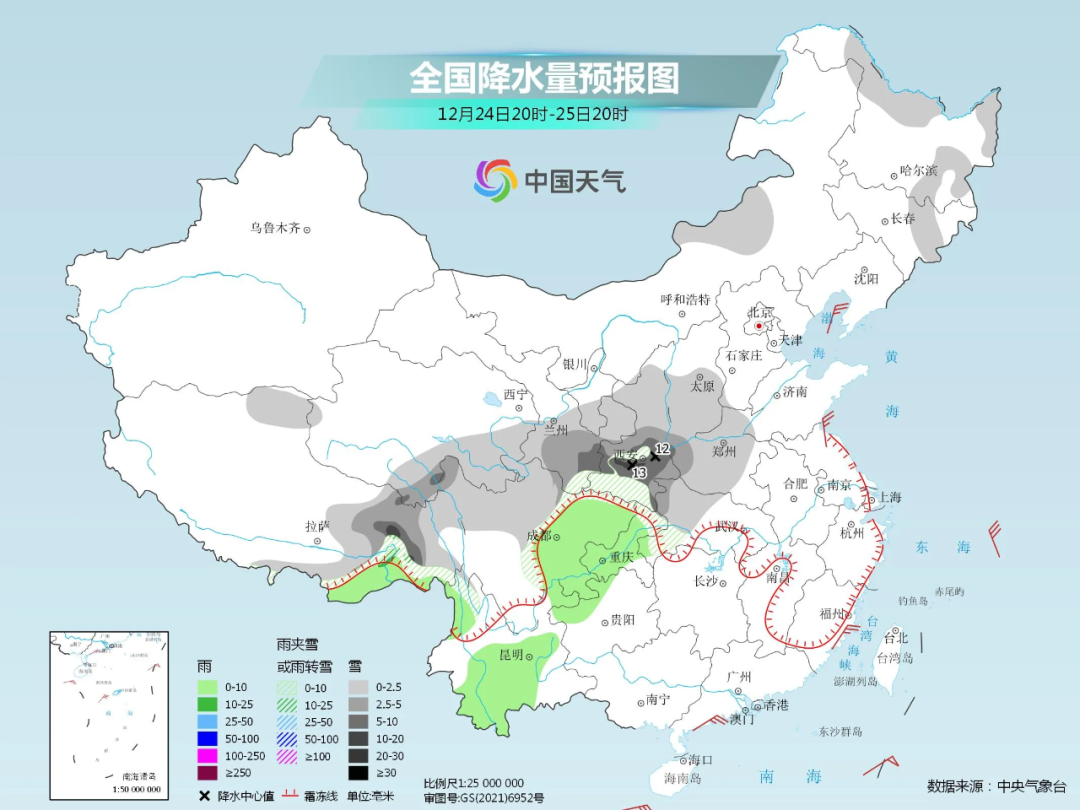 從24日夜間開始,西部地區的雨雪也將發展起來。中央氣象臺預計,24日夜間至25日,青藏高原東部、西北地區東部、華北西南部、黃淮西部、湖北西部、四川西部和北部等地有小到中雪或雨夾雪,局地大到暴雪。