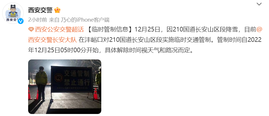 12月25日,因210國道長安山區段降雪,目前西安交警長安大隊在灃峪口對210國道長安山區段實施臨時交通管制。管制時間自2022年12月25日05時00分開始,具體解除時間視天氣和路況而定。