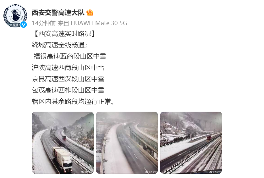 繞城高速全線暢通;福銀高速藍商段山區中雪;滬陜高速西商段山區中雪 ;京昆高速西漢段山區中雪;包茂高速西柞段山區中雪;轄區內其余路段均通行正常。