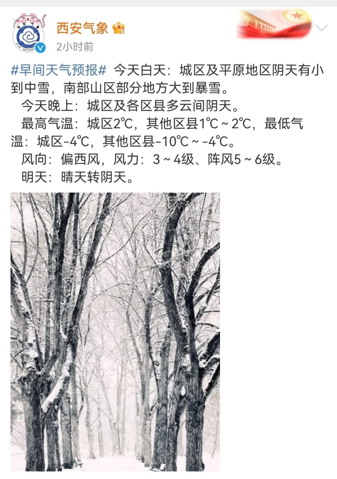 據陜西氣象最新預報,今天白天:榆林、延安北部陰天轉多云,延安南部、關中北部有小雪,局地有中雪。陜南中西部有雨夾雪或小雪。關中南部、陜南東部有小到中雪,寶雞南部局地、西安南部局地、渭南南部局地、商洛北部局地、秦巴山區局地有大到暴雪。陜北西部、關中西部、陜南中西部、秦巴山區日平均氣溫下降 4-6℃。陜北有 4-5 級偏北風。早上關中中西部、陜南西部、秦嶺山區有輕霧。