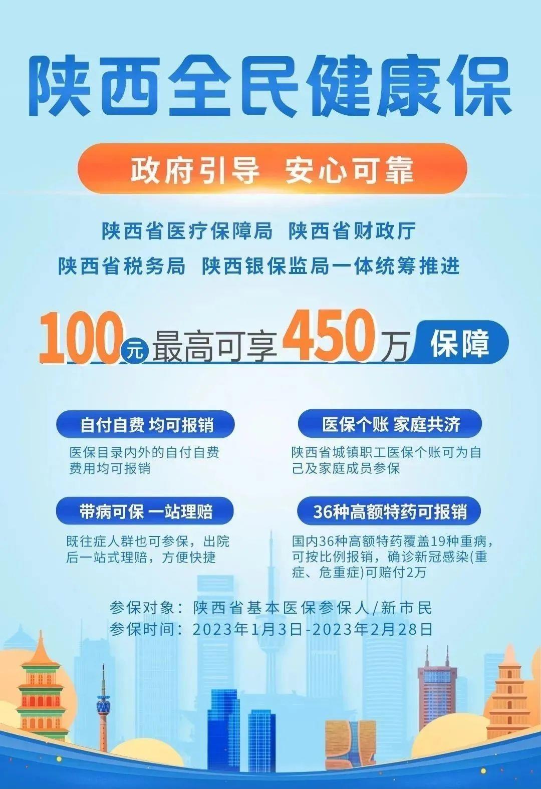 啟動儀式后,參保繳費工作已在全省范圍內啟動。2023年1月3日至2月28日期間,關注“陜西全民健康保”微信公眾號,點擊“我要投保”,填寫信息支付后,即可投保成功。陜西省城鎮職工參保對象還可使用醫保個人賬戶為自己、配偶、子女和父母購買,保障責任于2023年1月1日起生效。