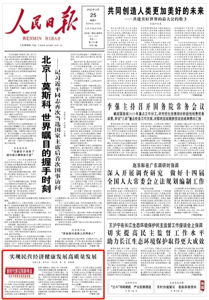3月25日,《人民日報》頭版刊發文章《實現民營經濟健康發展高質量發展(新時代新征程新偉業·堅定不移推動高質量發展)》,其中聚焦陜西民營經濟發展。