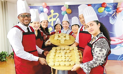 9月26日,山東省東營市東營區(qū)勝利街道勝景社區(qū)居民活動室里,山東科瑞控股集團的兩名外籍員工姆吉卡(右)、阿莫德(左)和社區(qū)居民在專業(yè)糕點師指導(dǎo)下學(xué)習(xí)制作月餅,迎接中國國慶和中秋佳節(jié)的到來。xB2安康新聞網(wǎng)