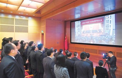 | 圖為當地時間10月17日晚,中國駐美國大使館全館人員在館內放映廳屏幕前觀看十九大開幕式。 |