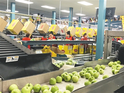 | 美國華盛頓州著名水果產地韋納奇的Auvi 果品公司包裝廠的自動生產線,對剛釆摘下來的青蘋果進行清洗、質量檢測、上蠟、包裝等一條龍加工流程,然后通過中國電商平臺天貓快遞到中國消費者手中。 |