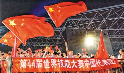 | 圖為日前在阿拉伯聯(lián)合酋長國舉行的第44屆世界技能大賽開幕式上,人們揮舞著中國國旗歡迎中國代表團(tuán)入場。 |