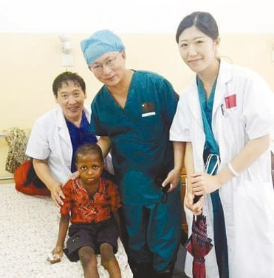 楊鐵軍這次到達(dá)幾內(nèi)亞后實(shí)施手術(shù)的第一例患者是一名6歲兒童。這位兒童遭遇了車禍,傷勢嚴(yán)重,右上肢和下肢都有骨折、右股骨粉碎性骨折。小患者已經(jīng)住了很久醫(yī)院,但是當(dāng)?shù)卮蠓虿恢廊绾谓o這個孩子治療,只能暫時用石膏固定病肢。在楊大夫給小患者成功手術(shù)后僅兩周,小患者右上肢石膏已拆除,活動自如。孩子父母對中國醫(yī)療隊(duì)的感激溢于言表,孩子天真稚氣的小臉上又重現(xiàn)了往日的歡樂笑容。