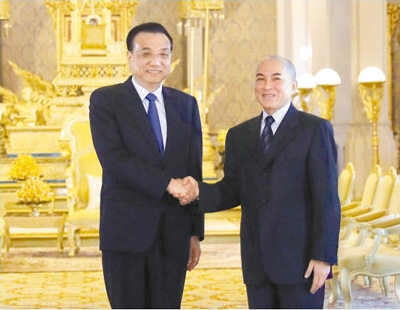 國務院總理李克強當地時間1月11日中午在金邊王宮會見柬埔寨國王西哈莫尼。