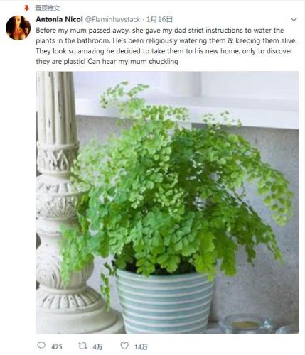 英國女消防員尼科爾近日在推特上發文寫道:“家母離世前曾留下嚴格指示,要我爸爸為浴室內的植物澆水。他定期澆水灌溉,它們很漂亮,他搬家時決定一起帶走,卻發現它們是塑料的!我彷佛聽到媽媽正在咯咯地笑。”