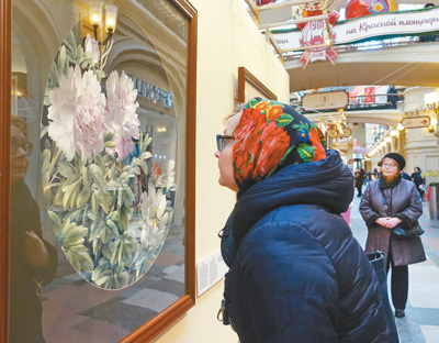 | 春節期間,在古姆百貨展出的中國刺繡作品吸引了不少莫斯科市民參觀。 |