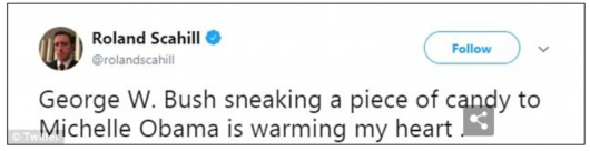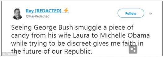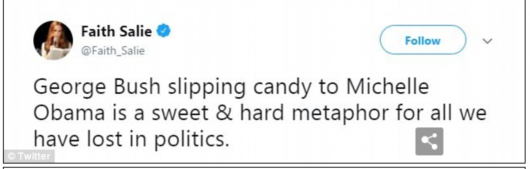 “看到小布什從妻子手中接過糖果給米歇爾,同時又試圖保持謹慎,讓我對共和黨的未來充滿希望。”