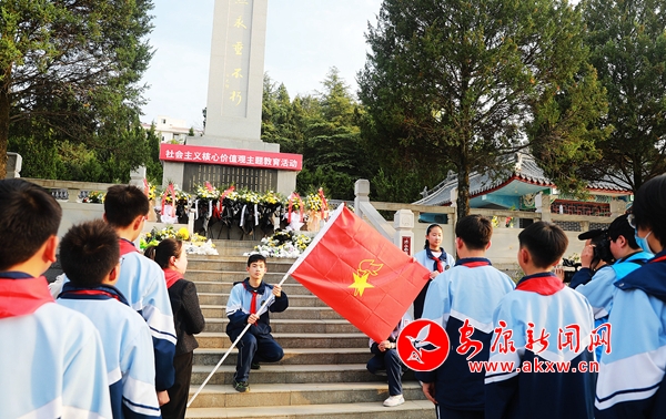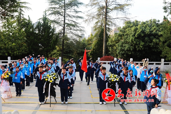 隨著激情昂揚的出旗曲奏響,祭奠活動開始。鮮艷的星星火炬旗幟緩緩向前,在明艷的紅色下,金燦燦的星星在陽光下格外耀眼。隨后,少先隊員們獻唱《我們是共產主義接班人》,大家滿懷熱情,為革命烈士訴說自己的情感。紀念碑前,伴隨著充滿哀思的《獻花曲》,幾位同學莊嚴地將花籃送上祭臺并整理挽聯,同學們排隊上前送上自己手制的白花。高大的紀念碑在黃白菊花和淡雅白花的映襯下,格外莊嚴肅穆。Gjp安康新聞網