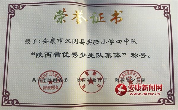 安康新聞網訊(通訊員  林愛銘)日前,在中國少年先鋒隊陜西省第七次代表大會上獲悉,漢陰縣實驗小學四(一)中隊、教體局群團工作負責人陳文保、平梁鎮中心小學姚仲鑫同學分別榮獲“陜西省優秀少先隊集體”、“陜西省少先隊工作先進個人”、“陜西省優秀少先隊員”殊榮。ZPV安康新聞網