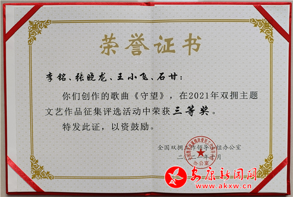 本網訊(通訊員 歐定揚)漢陰縣文旅廣電局文化干部李銘與其戰友創作的歌曲《守望》榮獲2021年度全國雙擁主題歌曲征集三等獎,據了解,這也是近幾年來漢陰縣在雙擁和文化宣傳工作上所獲得的又一獎項。