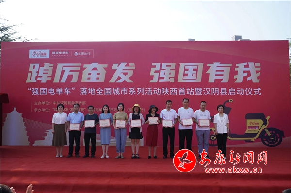 活動(dòng)為2021年度學(xué)習(xí)強(qiáng)國(guó)“學(xué)習(xí)之星”獲得者進(jìn)行了表彰,與會(huì)領(lǐng)導(dǎo)共同為“強(qiáng)國(guó)電單車”揭幕,標(biāo)志著“強(qiáng)國(guó)電單車”正式落地陜西省漢陰縣。