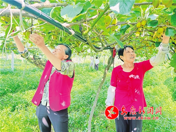 走進觀音河鎮水田村獼猴桃種植基地,放眼望去,片片綠葉下,一個個果型飽滿、大小勻稱的獼猴桃掛滿枝頭。陽光透過片片綠葉,照射在青黃色的果實上,清新的果香隨風四溢。