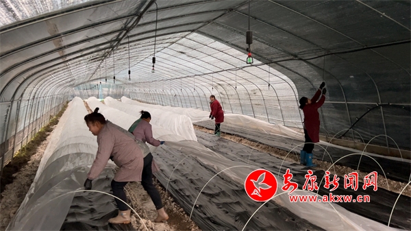 在漢陰七葉蓮鑫聚農業科技有限責任公司的蔬菜大棚里,工人們正在為移栽不久的圣女果、西紅柿等蔬菜幼苗覆蓋二層鞏膜,同時,對育苗溫室、塑料大棚等設施進行全面檢查,發現問題及時維修,確保設施安全。