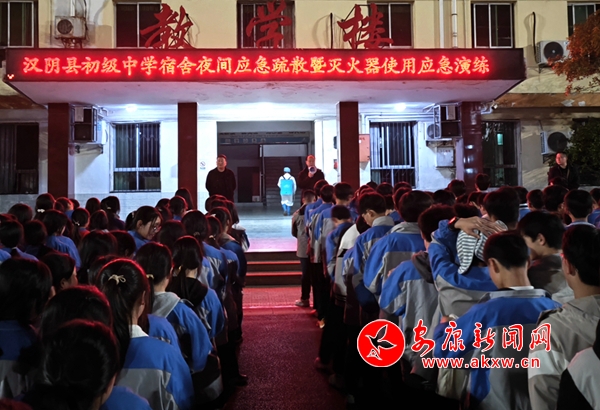 本網訊(通訊員 蘭本波)為切實做好校園消防安全工作,提升廣大師生消防安全意識和自護自救能力,進一步筑牢校園安全防線。 3月25日,在第29個“全國中小學生安全教育日”到來之際,漢陰縣初級中學組織全體住校師生開展了宿舍夜間應急疏散暨滅火器使用應急演練活動。vD2安康新聞網