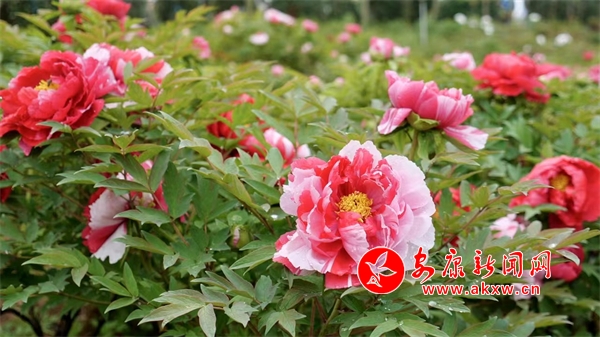 走進牡丹園中,一朵朵牡丹花開正艷、絢麗多彩,陣陣花香沁人心脾、令人陶醉。從空中俯瞰,五顏六色的牡丹花次第開放,妖嬈的花朵掩映在綠色的枝葉中,一團團、一簇簇,開得甚是熱鬧,可謂“百花”齊放、香氣四溢。走近細看,白牡丹綻開著白色的花瓣,雪白的多層花瓣中心吐露出金蕊,素雅且端莊;紫牡丹花瓣重疊,雍容華貴,絢麗奪目;粉牡丹恰似少女的臉龐,嬌艷欲滴,煞是可愛。