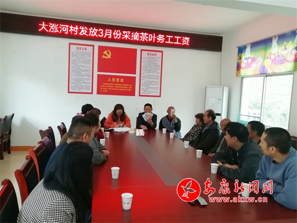 “第一名,二組李正國,15天4100元,第二名……”4月9日,在漢陰縣漩渦鎮大漲河村委會,大漲河茶葉專業合作社為村內和周邊村的采茶工發放3月份采茶工資74066元,80多名茶農領到了春后采茶的第一份工資。