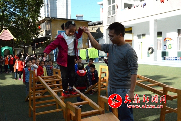 在嵐皋縣第二幼兒園,來自新北區銀河幼兒園教師魏劍正和小朋友們在室外活動,在他的不斷引導鼓勵和示范帶動下,小朋友們大膽嘗試高空過木橋。
