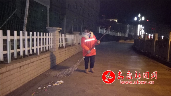 圖為環衛工人吳志美大年初一、初五凌晨街上空無一人的時候,她默默的在清掃大街小巷(筆者晨練偶遇隨拍), 他用一身寒霜溫暖縣城清晨!C7c安康新聞網