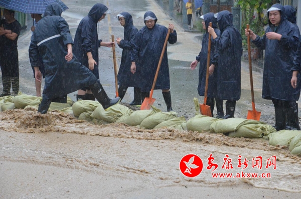 聚沙筑堤,攔水導流。在農田社區旁柏油路上,水流順坡流下,地勢較低的路面完全被積水覆蓋。經過現場察看災情,救災方案商定為在路面斜向搭建一條臨時堤壩,將水流導入河溝,將沙袋連成一排,填充壓實,成功筑起一條排水堤壩。