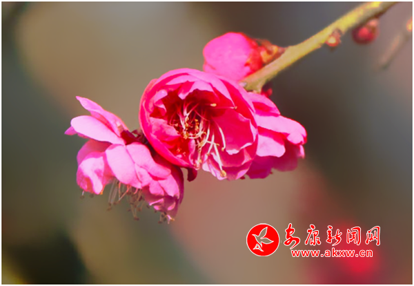 ■廖霖嵐河岸畔梅花開,探春尋梅正當時。在嵐皋縣城蓮花公園植物園的林間,恰巧路過這幾棵花樹,忽然一回頭,看見幾株樹葉間露出幾朵嫣紅的花蕾,再一看樹上的花……