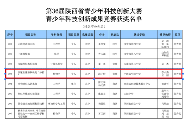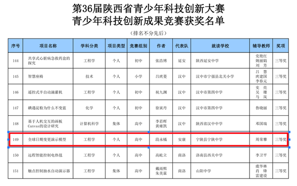 據悉,陜西省第36屆青少年科技創新大賽由省科協、團省委、省婦聯共同主辦。大賽分青少年科技創新成果競賽、科技輔導員創新成果競賽、青少年科技實踐活動、青少年科技創意比賽、少年兒童科學幻想繪畫比賽等五個類別。全省高中組青少年科技創新成果競賽共評出108個獎項,其中一等獎9項,被推薦參加全國大賽僅7項。我校兩名學生的科技創新項目榮獲一等獎,并拿到參加全國大賽通行證實屬不易,彰顯了學校科技創新特色發展的強大實力。