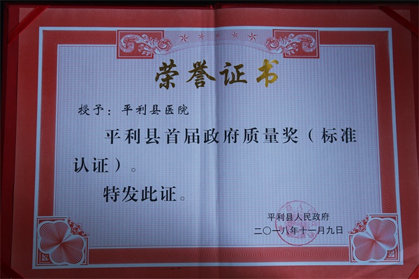 安康新聞網訊(通訊員 柯昌蘭 詹濤) 2018年11月9日,在平利縣人民政府召開的平利縣質量大會上,平利縣醫院榮獲平利縣首屆政府質量獎“標準認證獎”。