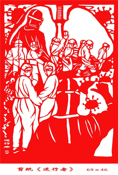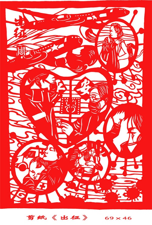 周玉珍作為安康市平利縣的一名小學美術教師,在做好學生、家長疫情防控宣傳教育的同時,戰“疫”中的許多瞬間,令她分外感動。她借個人居家防護的時機,完成了《出征》《逆行者》《戰疫》三幅剪紙作品,用鮮紅的剪紙記錄下了那些令人感動的瞬間。