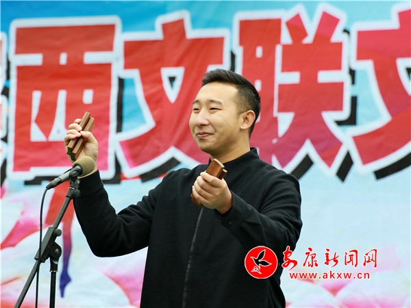 下午2點,社區文化廣場鑼鼓喧天,平利縣老縣鎮新時代農民文化宣傳隊以《戰鼓齊奏新時代》開場鑼鼓拉開慰問演出的帷幕,在陜西廣播電視臺節目主持人郝寧、李菲的報幕聲中,男聲獨唱《我愛你中國》、相聲《歡歌笑語》、戲曲選段《繡紅旗》、雜技《頂缸》、女聲獨唱《帕米爾,我的家鄉多么美》、陜西快書《老侯赴宴》、女聲獨唱《請到茶鄉來》、魔術脫口秀《歐買嘎》、男聲獨唱《把一切獻給黨》、小品《采訪的故事》、四重唱《幸福的誓言》等內容豐富、形式多樣的精彩節目接連登場,輪番表演,異彩紛呈的節目博得現場觀眾掌聲陣陣,喝彩之聲不絕于耳。演出期間,慰問小分隊的書畫藝術家向平利縣模范人物贈送了書畫作品。